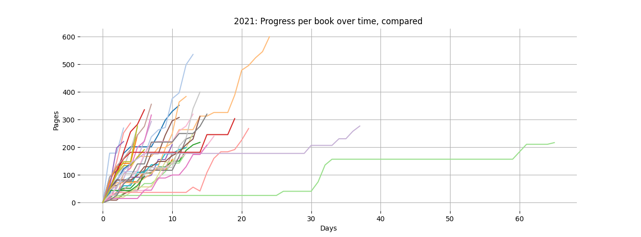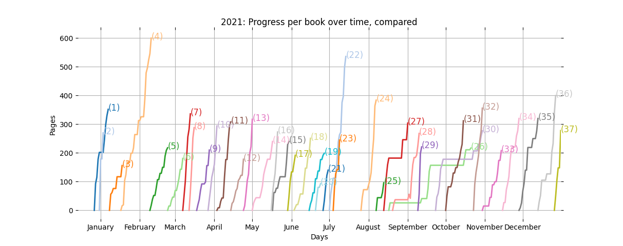 In 2021, I read 37 books for a total of 10087 pages. Considering that just two books more in 2019 made up for twelve thousand pages, I was reading significantly shorter books this year: an average length of just 272 pages, and that still took me, on average, 13.5 days to read.