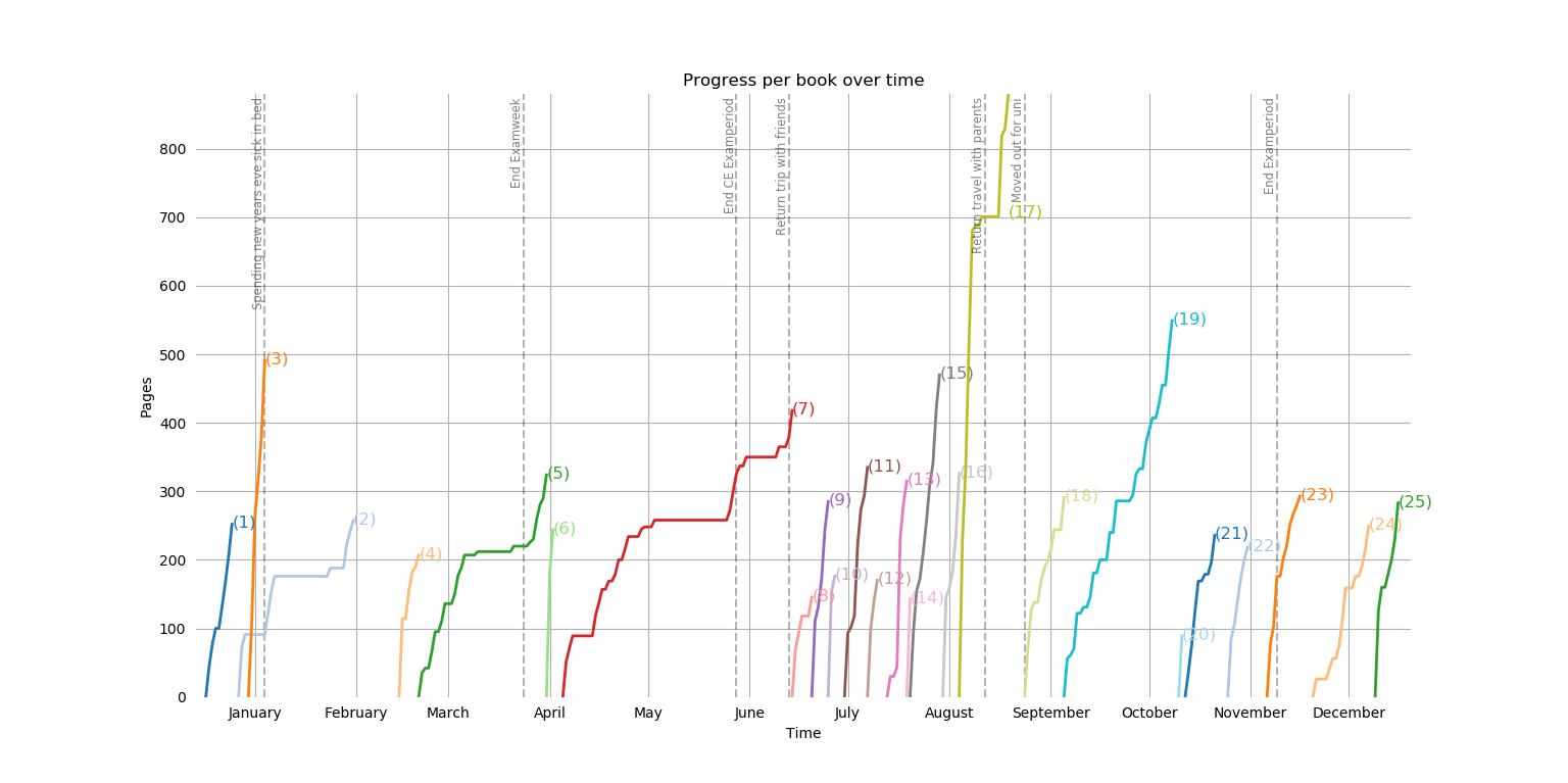 One little surprise about this year's timeline is the uniformity. I had pretty major life changes and they are almost undetectable. This year started with me writing my thesis. End of march I started an internship with a daily two hour commute, up until end of July. In between I moved cities end of April. I went travelling for a month and started at a new university in September. There are definitely some bursts of reading productivity, but I do not see how these correlate with my life phases. Reading has become a "fundamental habit", meaning that it does not rely on other habits. When I started to take reading seriously, I would read almost exclusively on trains. An example of a not-fundamental habit is writing this blog: I do it almost exclusively when I am procrastinating studying.