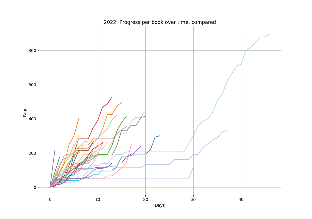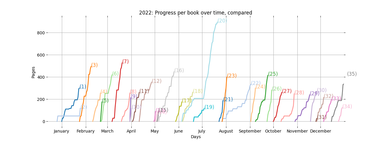 In 2022, I read 35 books for a total of 9572 pages. An average length of 273 pages, and that took me, on average, 13.26 days to read. Set myself the goal to read 35 books, but fell short by just a few days: finished the last book early January. But that is okay, the number of books is a bad proxy for reading activity anyway. If number of books was the end goal, I should've not read the almost 900 page-long Kissinger biography. But it was good though! I read it almost entirely in commute, so I have a visual, engraved in my mind, of the thick book with the pencil in the middle on that small train fold-out table. All-in-all, I am happy with this year of reading. Read a broad range of different genres, 20 non-fiction and 15 fiction. Next year, I want to read a few more "big books" and less short novels and temporary non-fiction. But I don't like to stick to strict To Read lists, reading is a hobby for me, driven foremost by curiosity, and I start books serendipitously. Often the decision to read a 400 page book is as unconsidered as whether to scroll through a blogpost. This is super irrational, a 400 page is approximately 10 hours of reading. Any other commitment of 10 hours will at least involve some cost-benefit analysis. Any rationalization for this precarious selection process (i.e. it promotes finding unknown unknowns, reduces confirmation bias, etc ) are, indeed, rationalizations. The arguments for this selection process might not be less valid, but they are definitely not causal arguments. Whatever.
