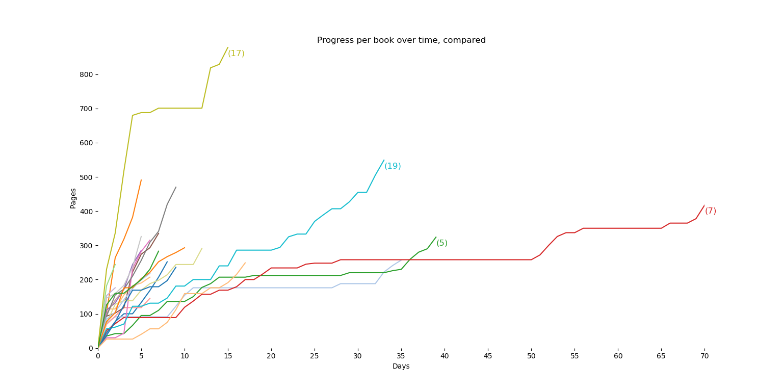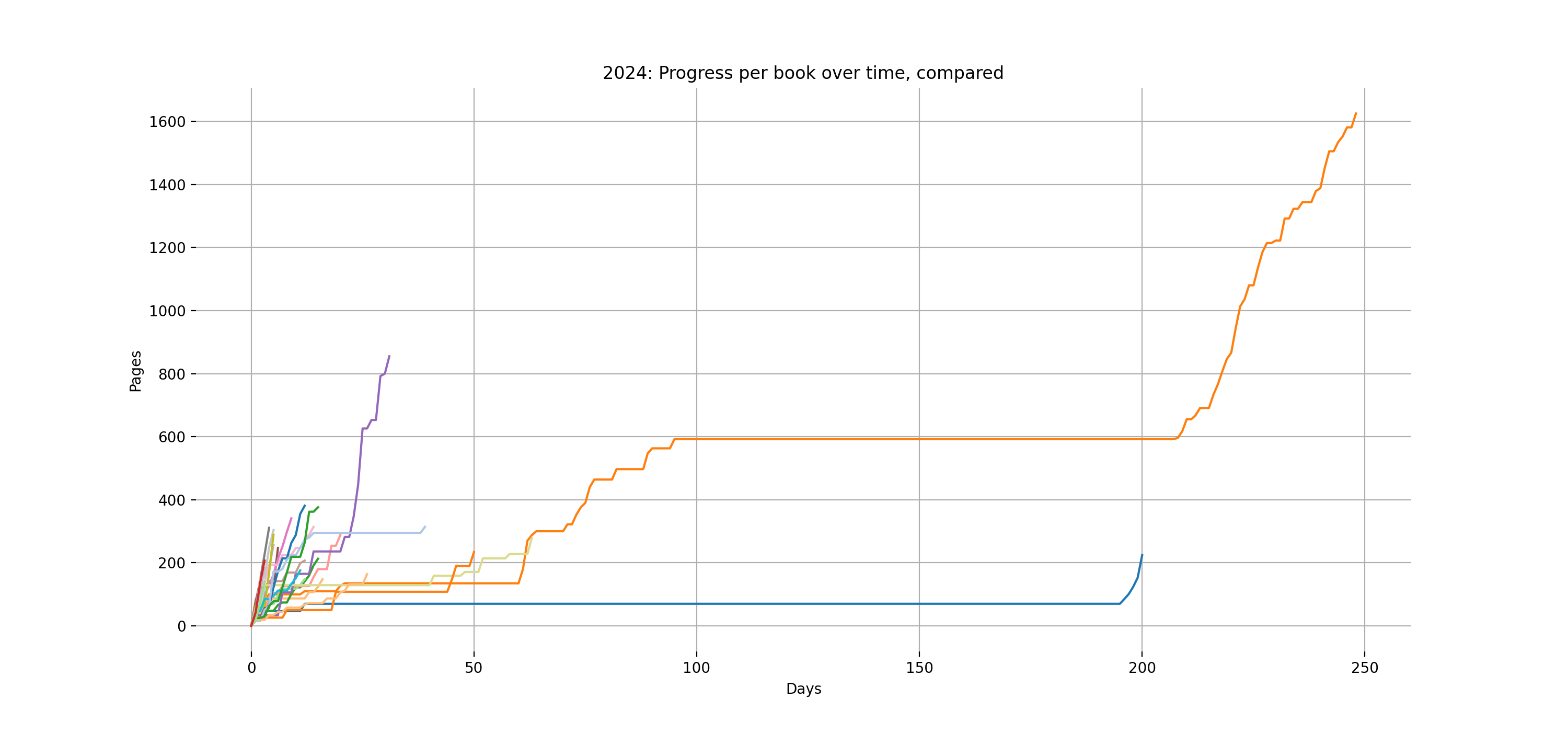 Another thing I tried was reading multiple books at the same time, see August and September. Mixed results, I was basically just slowly reading one book, and then quickly reading other books in between. Still need to get better at that. You can see the slow book, which took me more than two months, as a clear outlier below. The book is Ignition! by John Clark, a history of rocket propellants. It was fun, but definitely not a page turner.