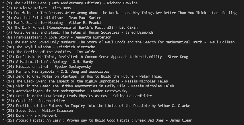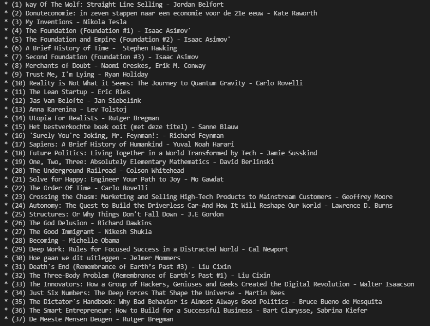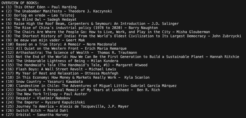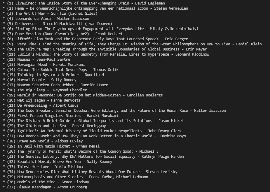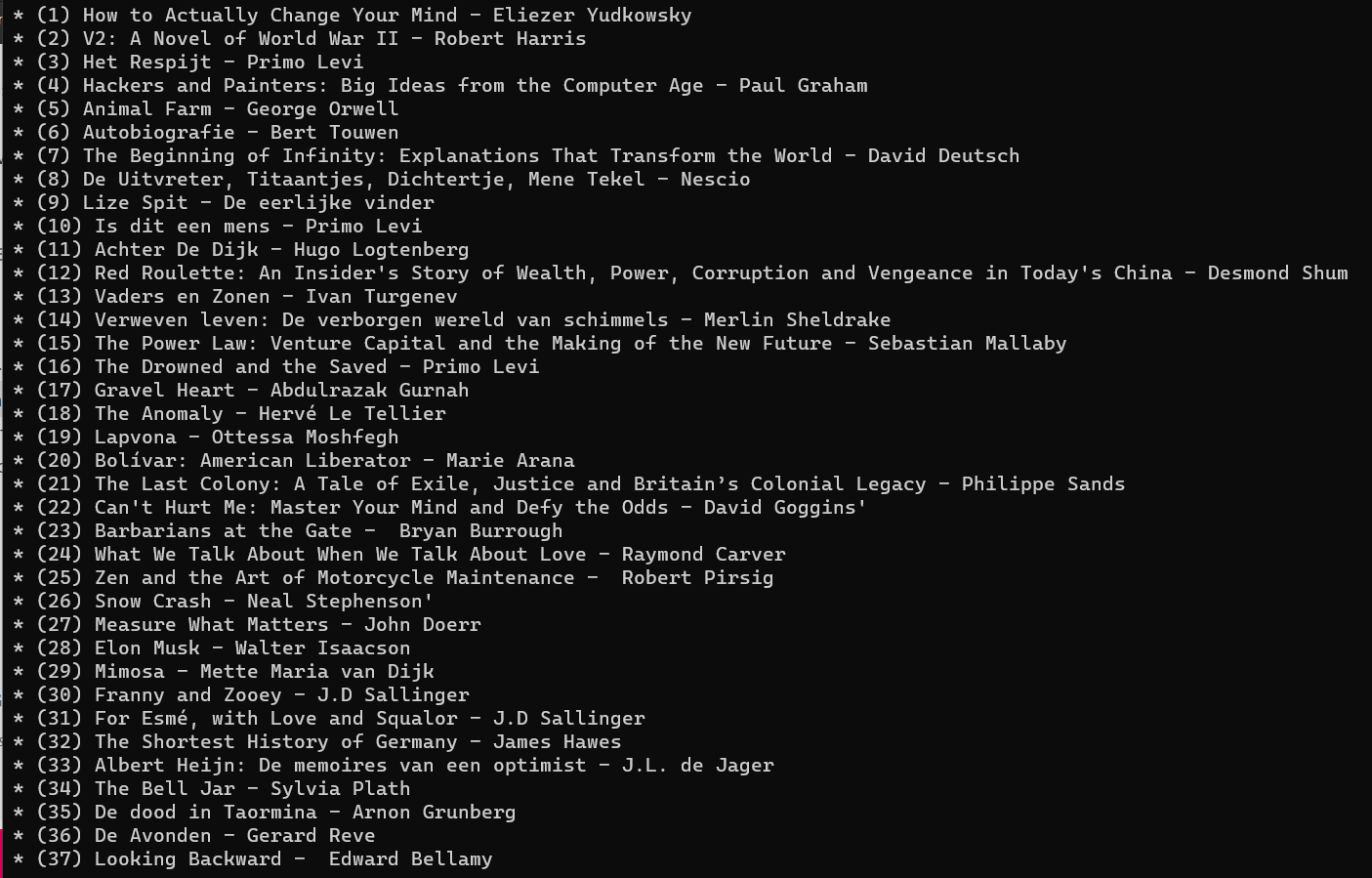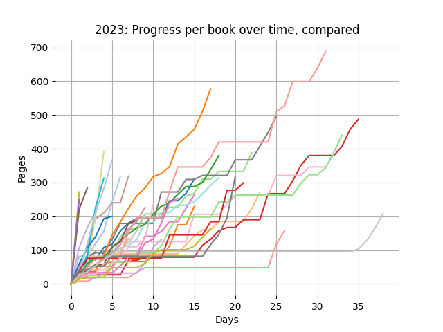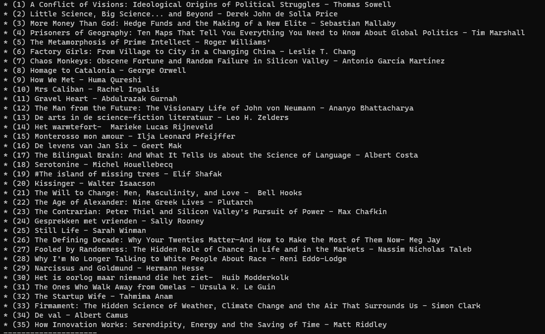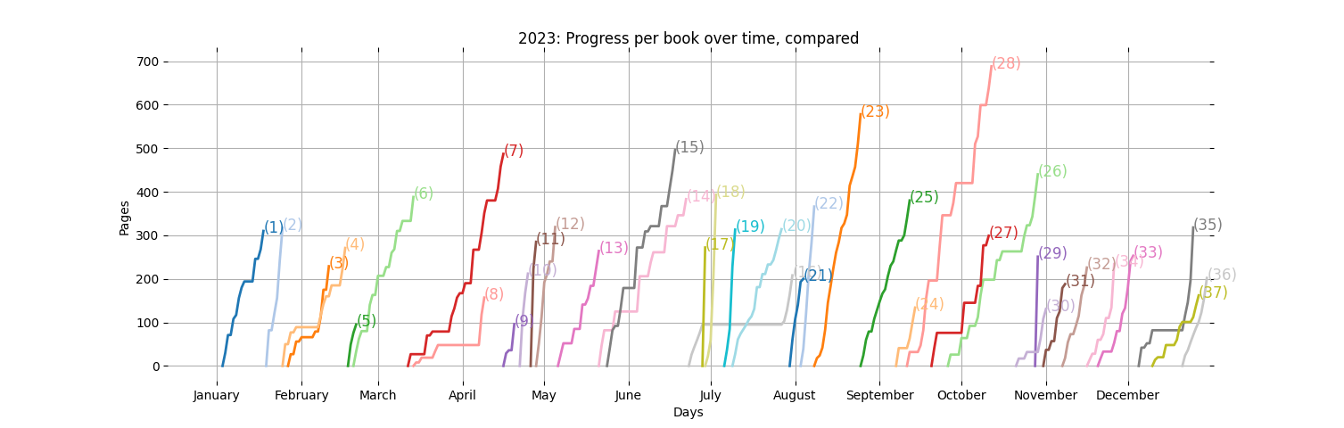 2023 consisted of 37 books, of an average of 293 pages that took me 15.41 days to read, for a total of 10859 pages. Biggest change in reading habit was a more even balance between fiction and non-fiction, and more comfort with reading multiple books at a time. That has always been a bit of a struggle for me, as I tend to just read one book that stays on my mind and that I keep going back to until it is finished. I started writing here and there in the second half of the year, some essays, but writing short stories is especially fun . This probably explains the emphasis on non-fiction.