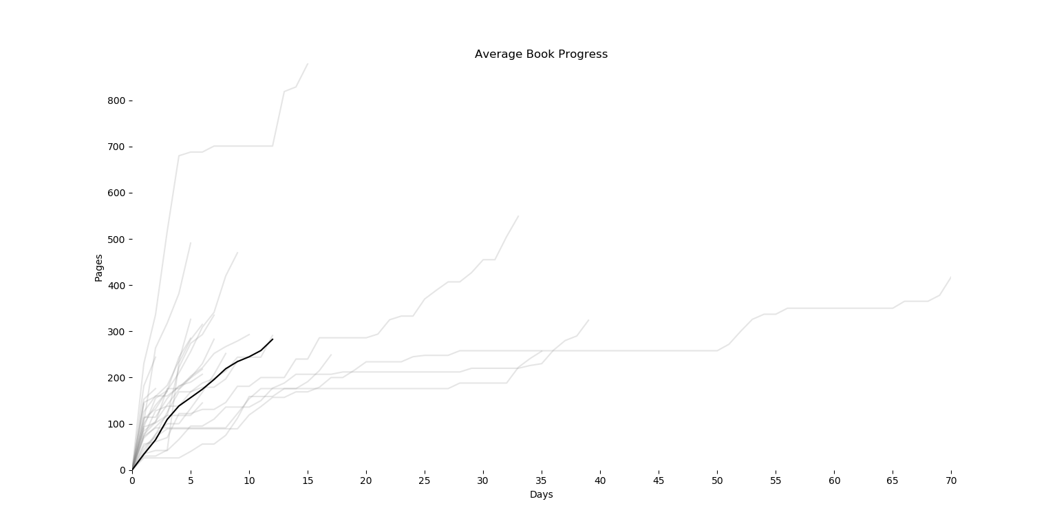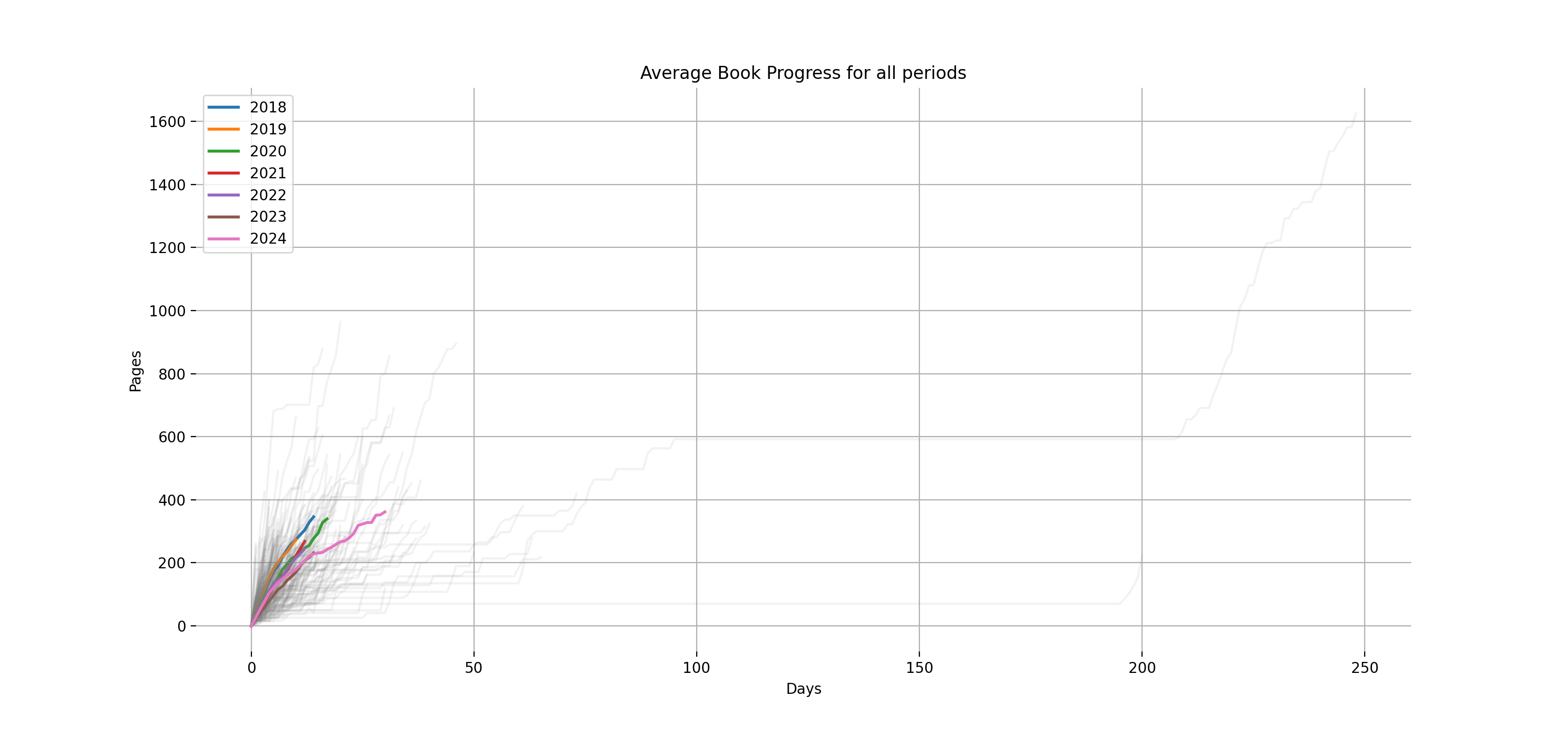 2018 was the first time I started tracking my reading, with the goal of motivating myself to keep it up a bit more. Read 25 books, with an average of 305 pages. That makes for 7645, with an average reading time of 14 days per book.