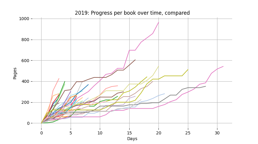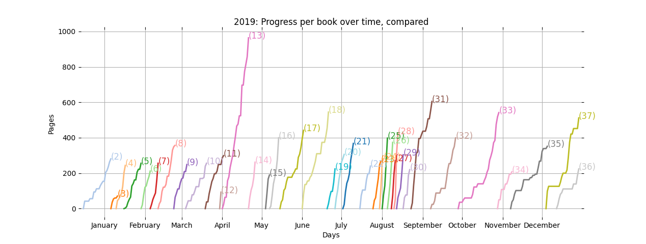 In 2019, I read 37 books, good for 12145 pages. Compared to other years, I guess you could say I was especially boring in this one. It was even before the pandemic! Really should've spent more time getting drunk. Instead I read over twelve thousand pages. What a waste. Anyway, the average book length was 328 pages, read over the course of, on average, 12 days.