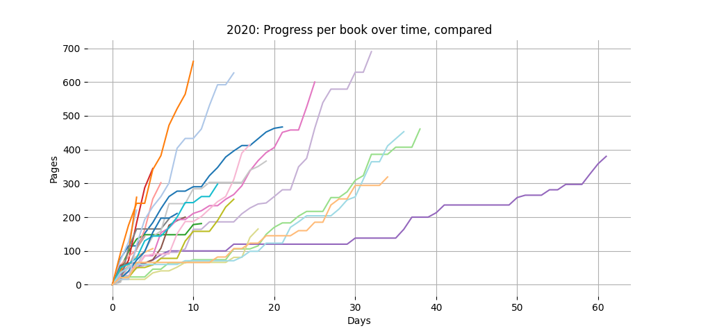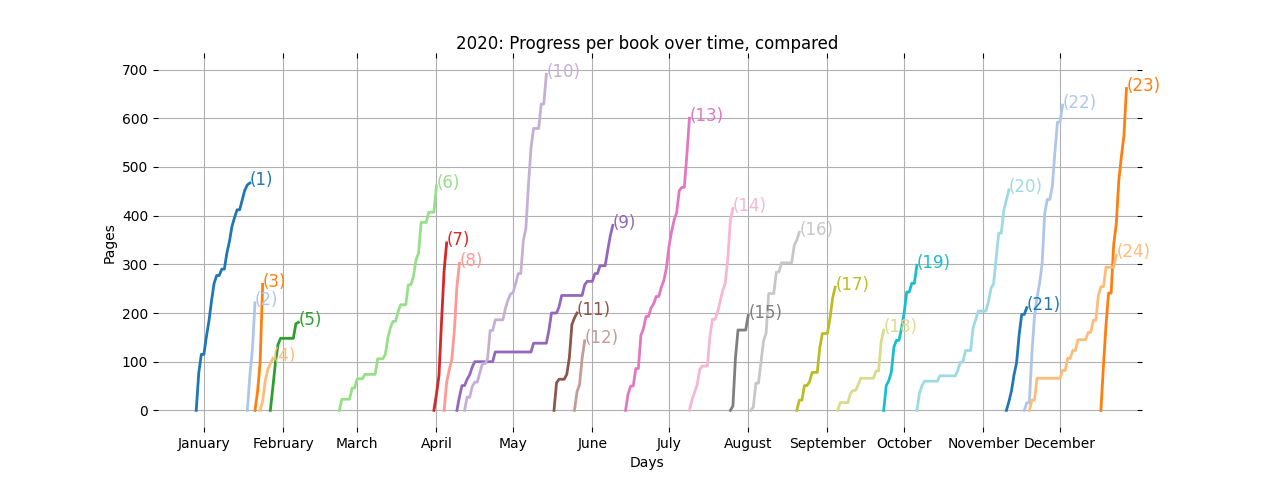 In 2020, I enjoyed 24 books good for 8318 pages. That is a slide back from 2019. Still, I was happy to have read some more pretentious books. That put the average length a bit higher, at 346 pages, which took me an average of 18 days to finish.