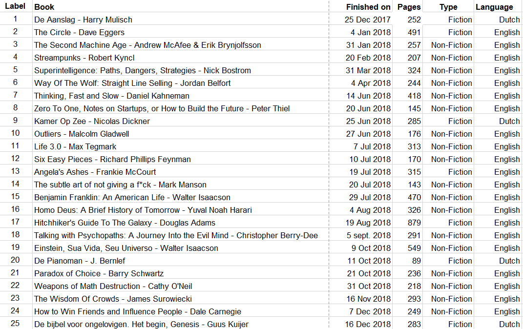 Additionally, I was just very consistent this year. The longest time it took me to finish a book was only one month, Innovators, by Walter Isaacson. I have read almost all books by Isaacson by now, and although packed to the brim with content, I enjoyed it the least. Maybe because of lack of novelty, maybe because his other biographies always include a lot of detours that keep it fresh. Innovators not so much, as the core subject is a lot to cover anyway.