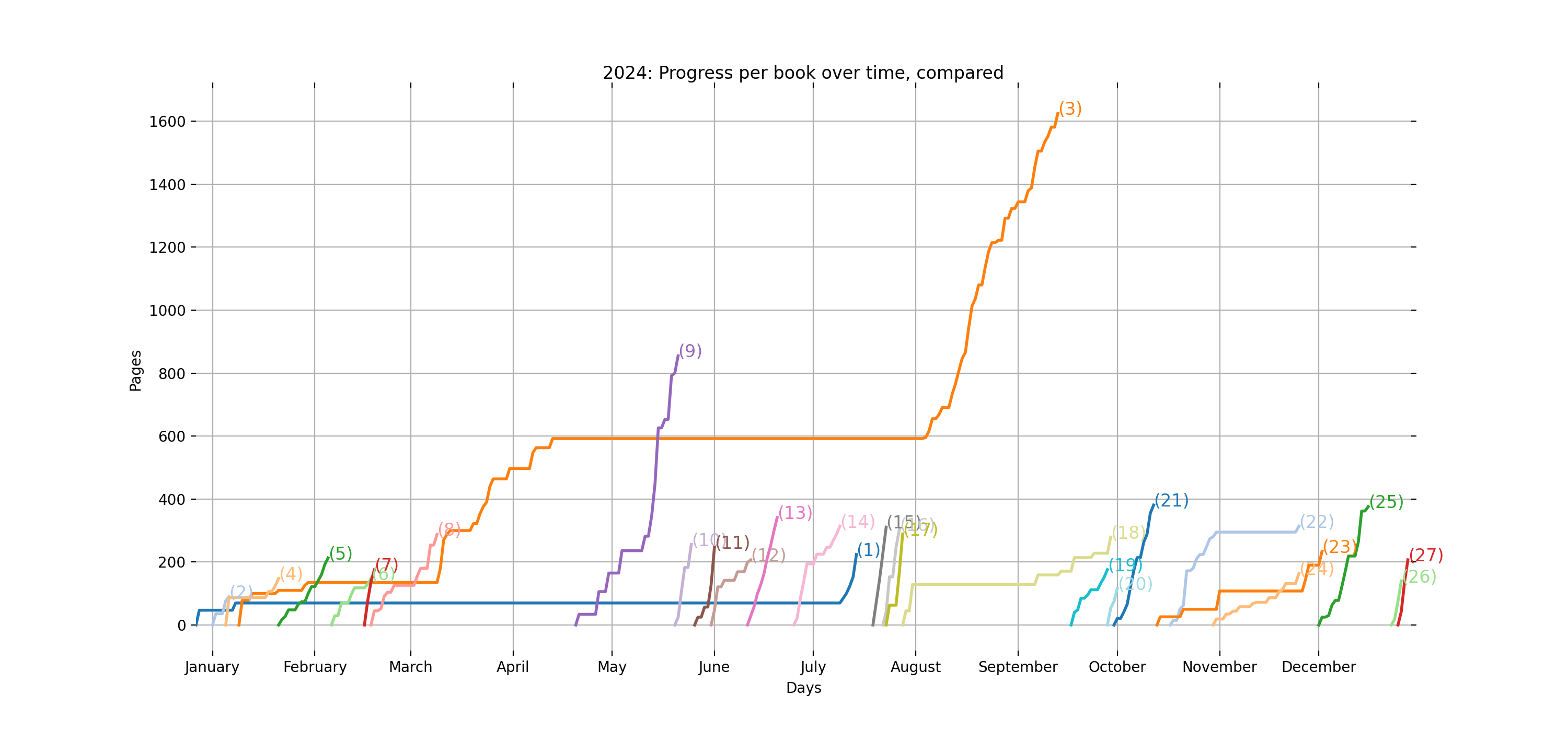 Notably in the individual books' trajectories is (7), Daniel Kahneman's classic, Thinking, Fast and Slow. It is one of my favorite books of all time, and I was rereading it at this point. So despite my slow progress, you should definitely read it, at a leisurely pace. Read a chapter a day, and google whether the research he mentioned failed to replicate too.